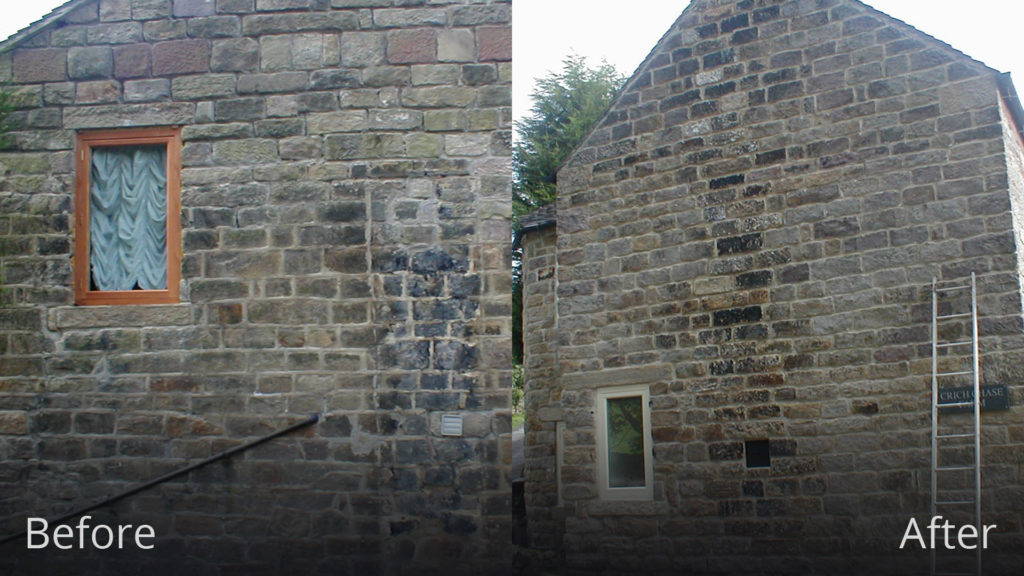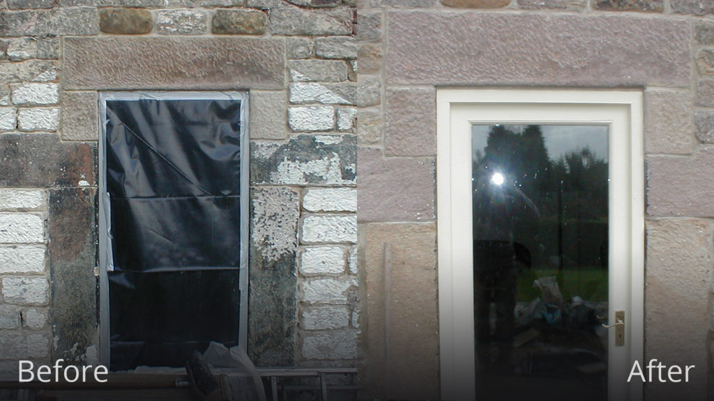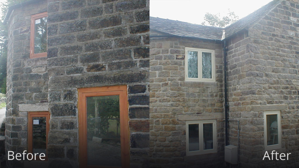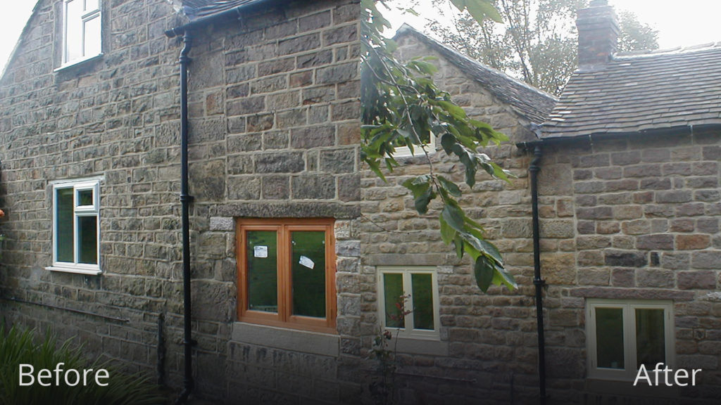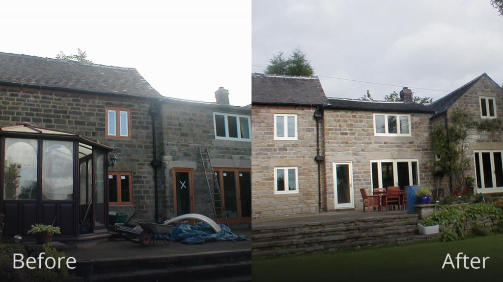 The conservatory was removed revealing the damage caused to the stone work. It was decided to chemical clean and repair the stone work, bringing the property back to its former glory.