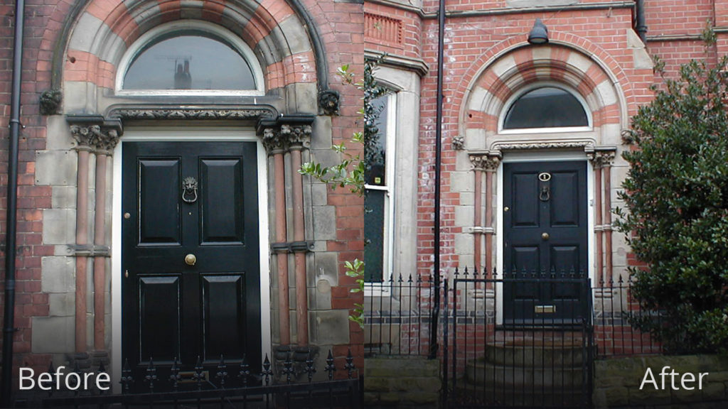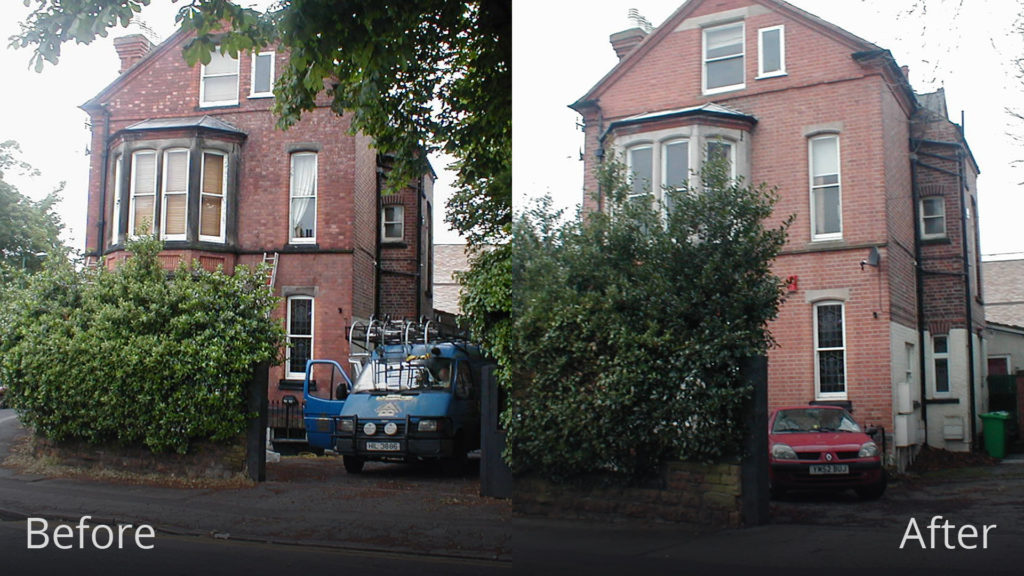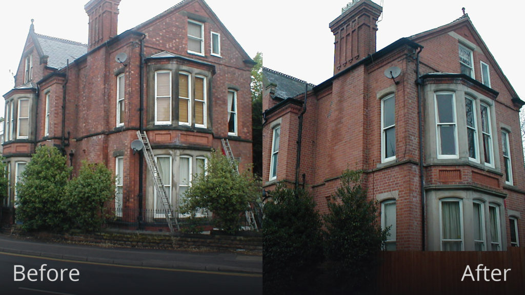 Chemical cleaned and repointed. Notice on after pictures effervescence ( otherwise known as salt) appearing. This is a sign that the brickwork is finally drying out from the poorly maintained guttering and downpipes.